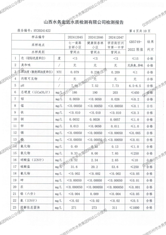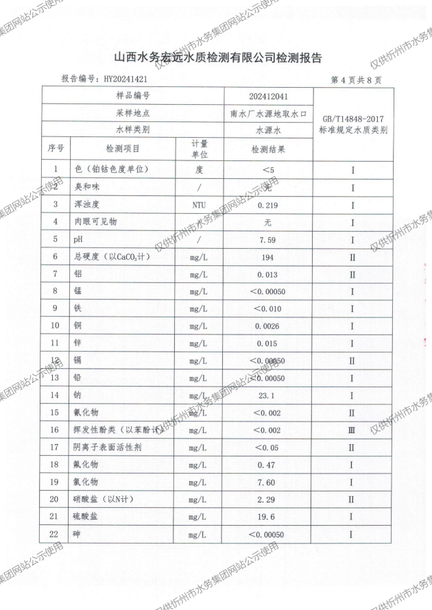 忻州城區公共供水水源水、出廠水、管網水、管網末梢水2024年12月份水質信息公示