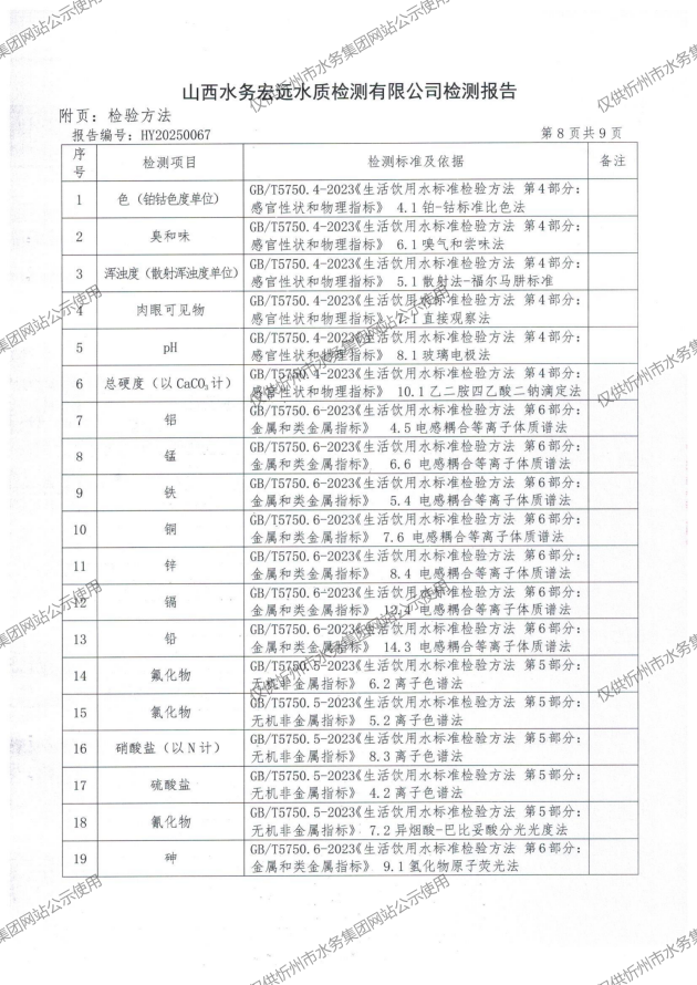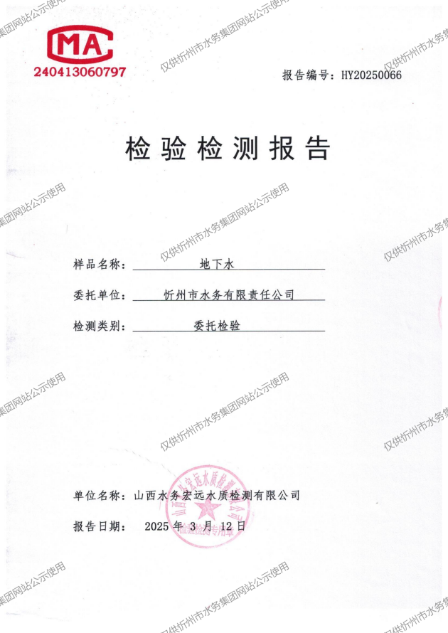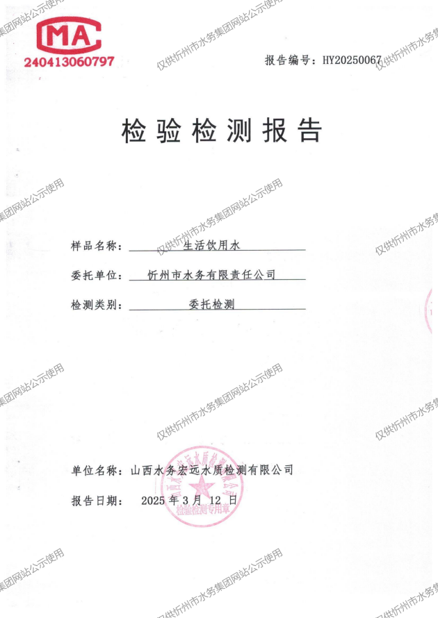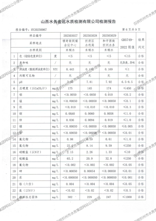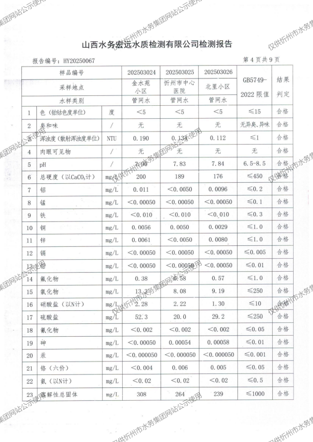 忻州城區(qū)公共供水水源水、出廠水、管網水、管網末梢水2025年3月份水質信息公示