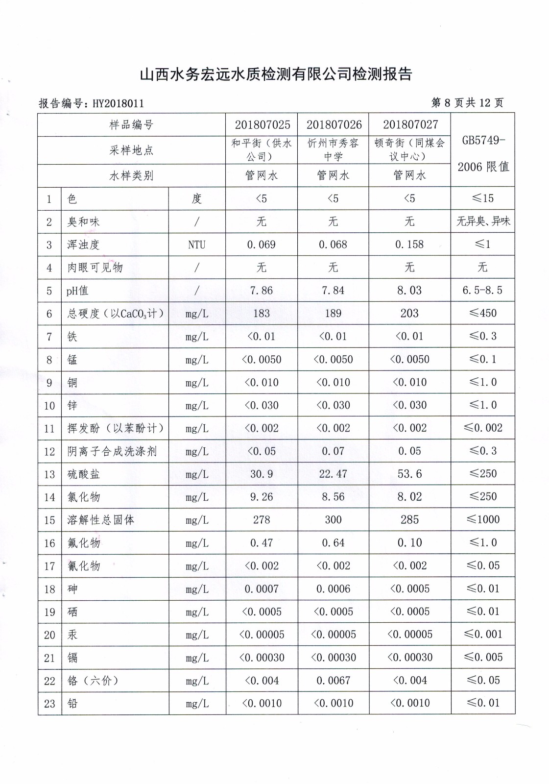 忻州城區公共供水水源水、出廠水、管網水、管網末梢水2018年7月份水質信息公示