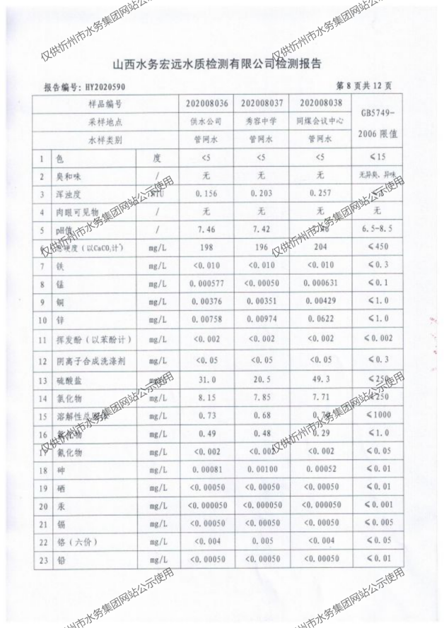 忻州城區公共供水水源水、出廠水、管網水、管網末梢水2020年8月份水質信息公示