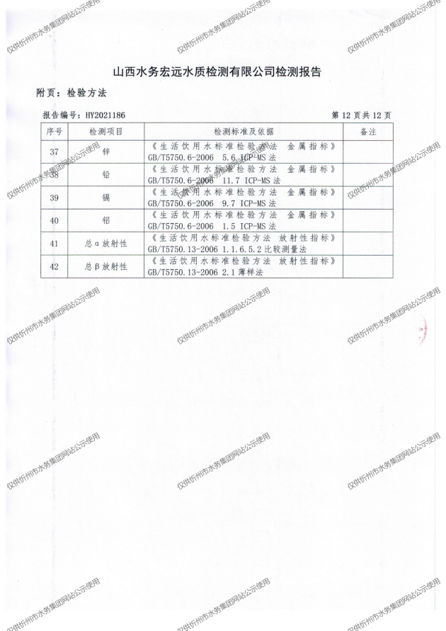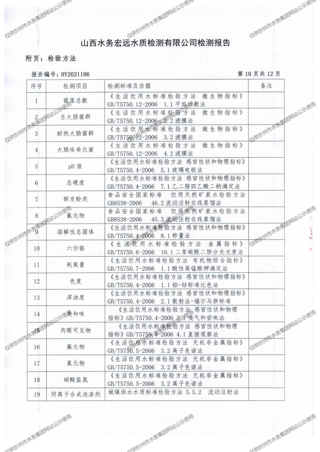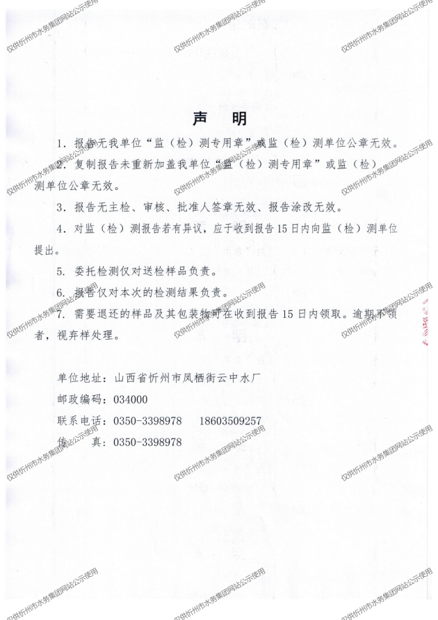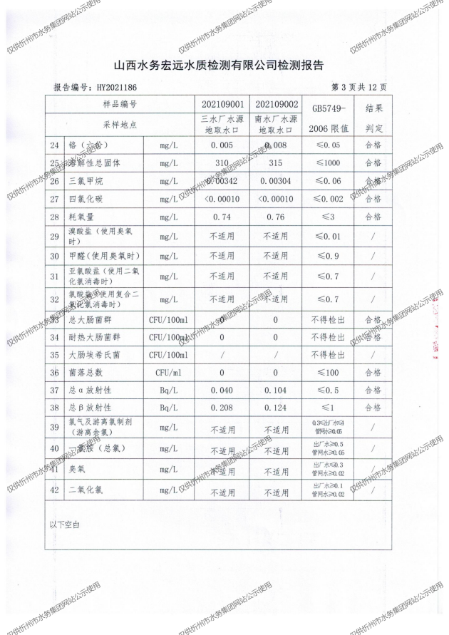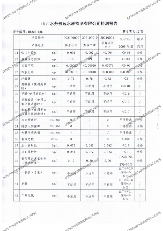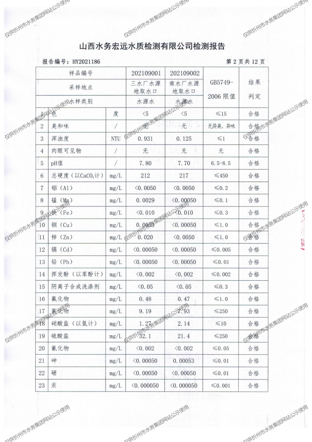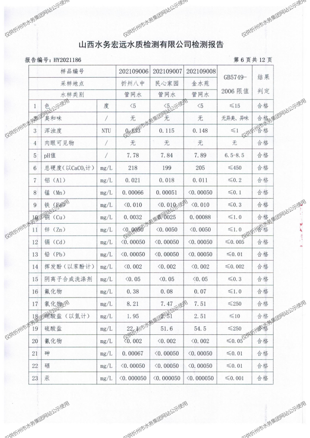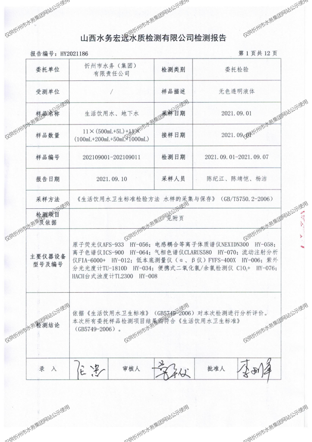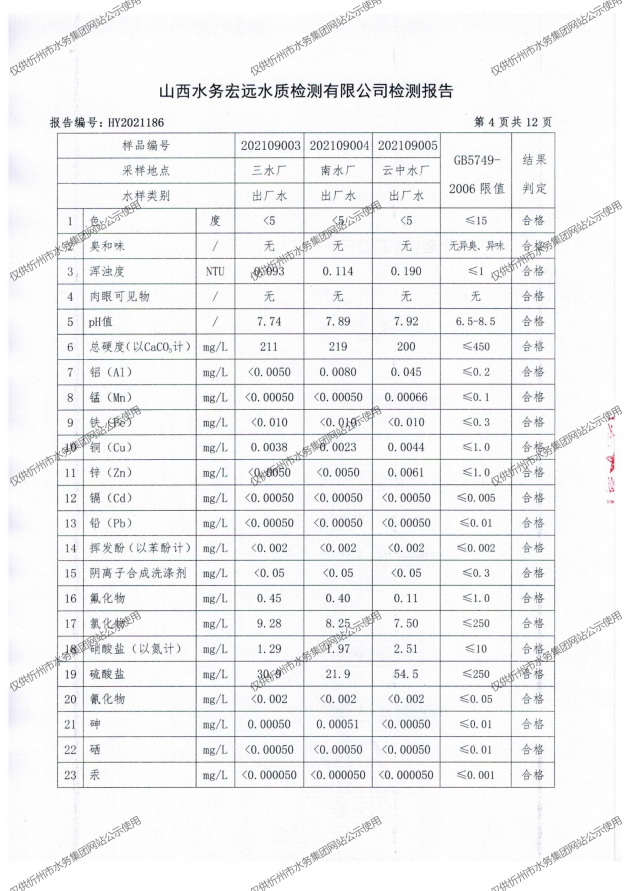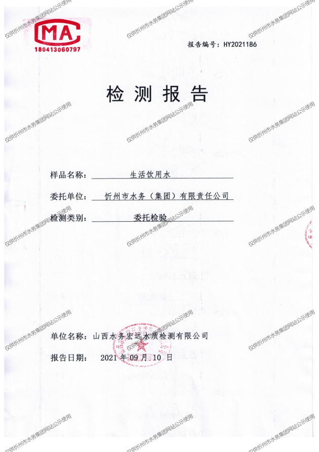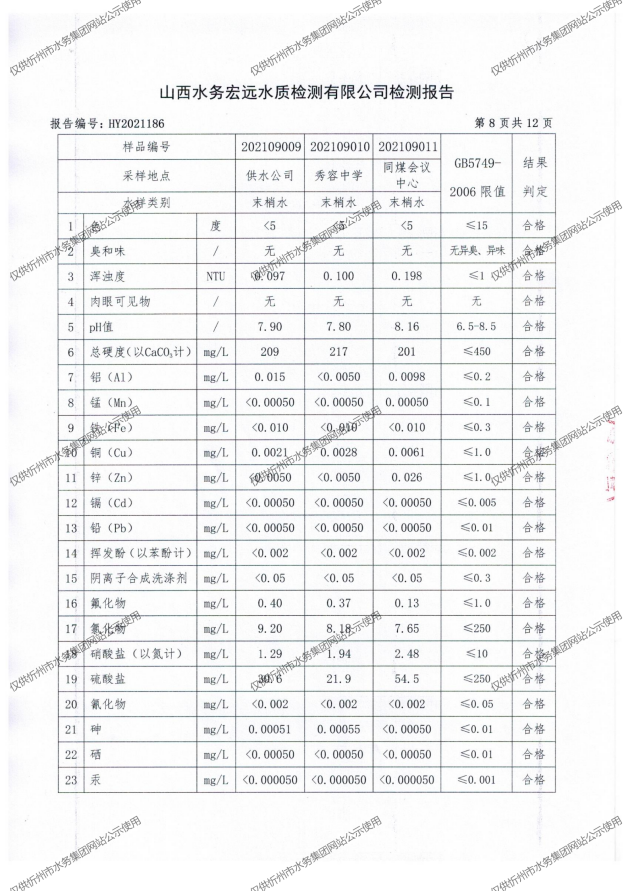 忻州城區公共供水水源水、出廠水、管網水、管網末梢水2021年9月份水質信息公示
