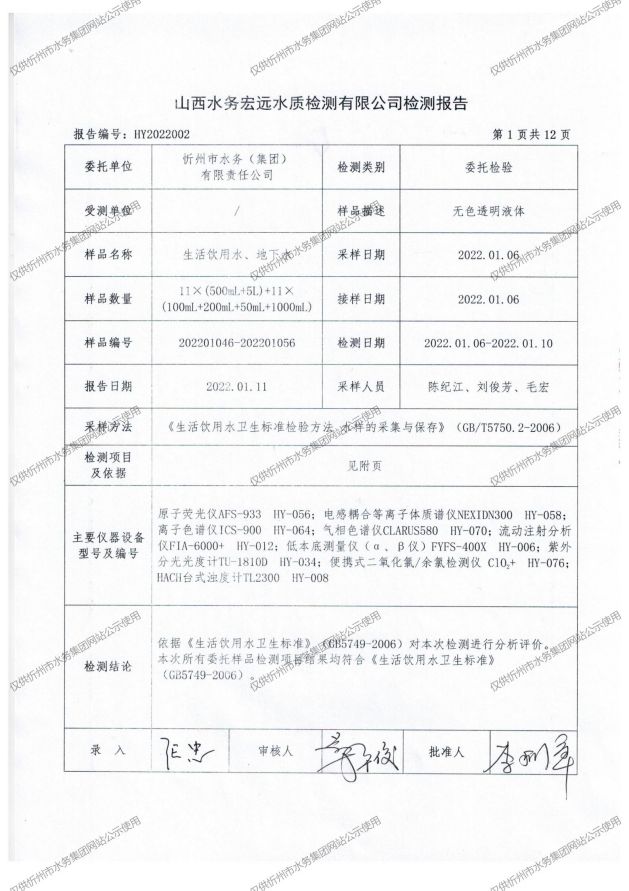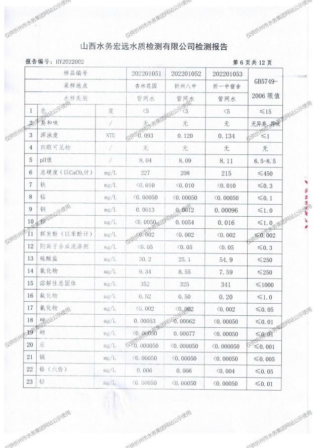 忻州城區公共供水水源水、出廠水、管網水、管網末梢水2022年1月份水質信息公示