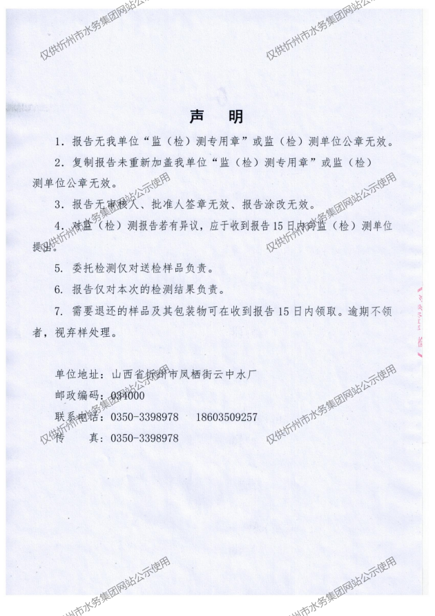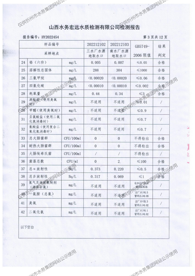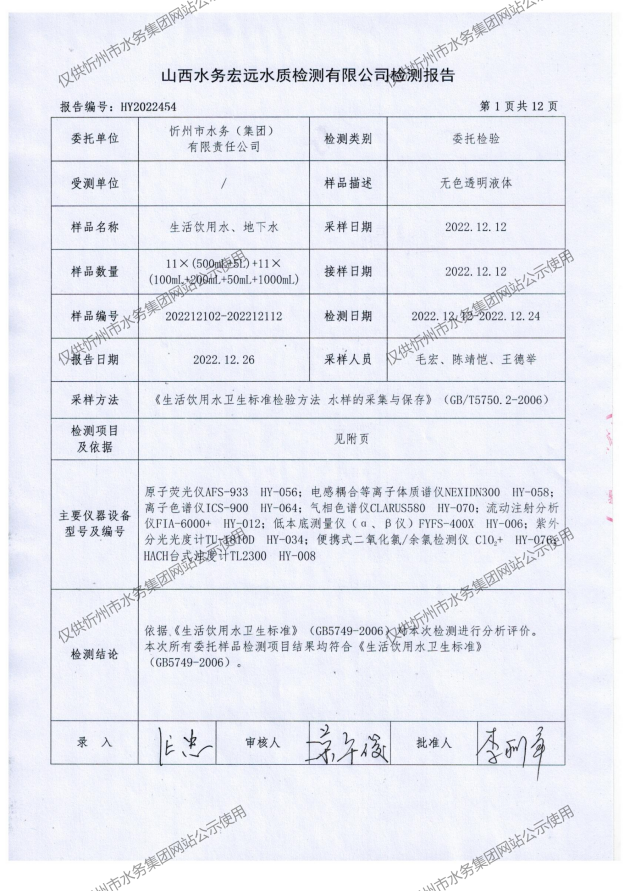 忻州城區公共供水水源水、出廠水、管網水、管網末梢水2022年12月份水質信息公示