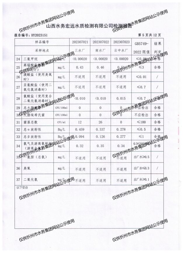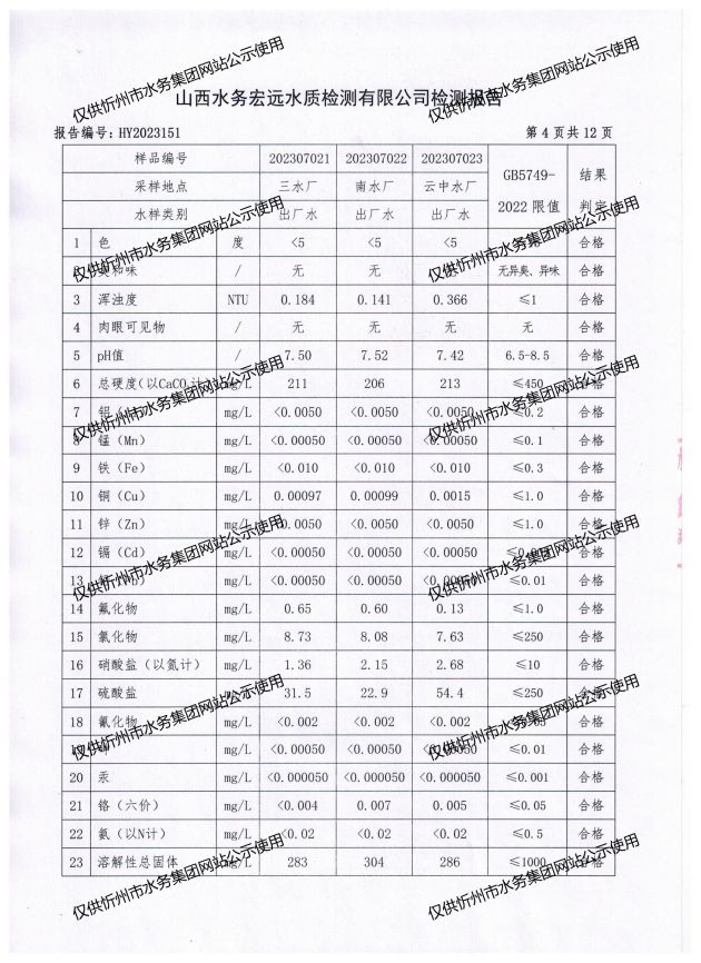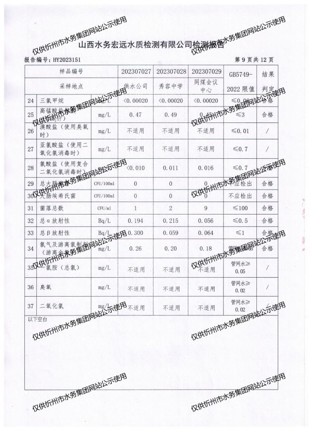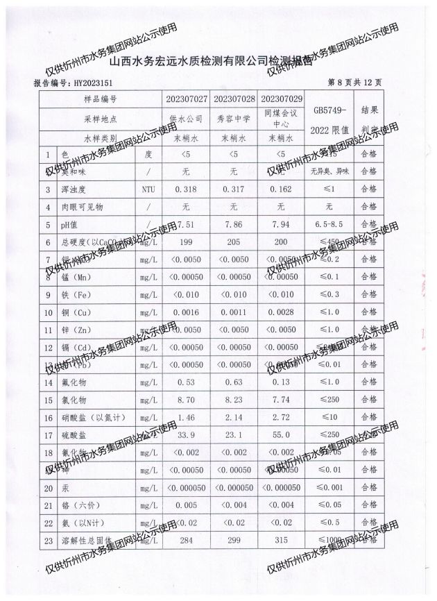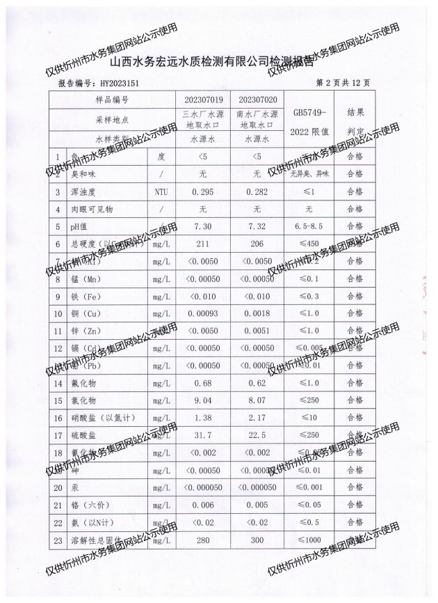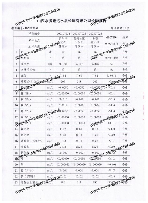 忻州城區公共供水水源水、出廠水、管網水、管網末梢水2023年7月份水質信息公示
