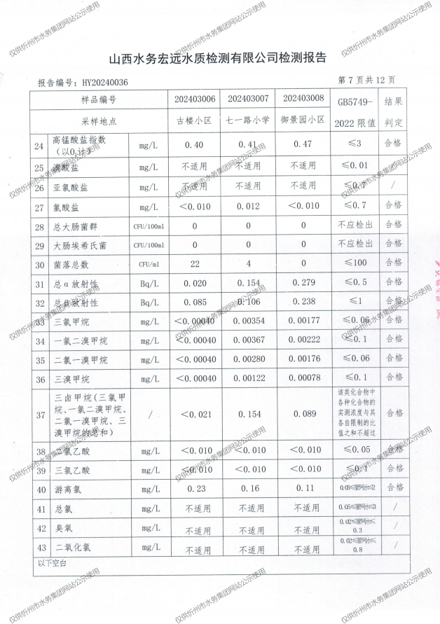 忻州城區公共供水水源水、出廠水、管網水、管網末梢水2024年3月份水質信息公示